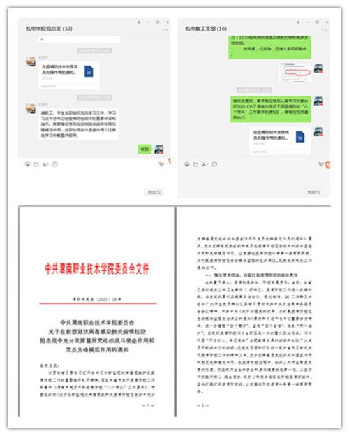 根据公司党委和机电党总支安排,2020年3月7日至3月11日,太阳成集团tyc122cc教工支部书记李敏宁利用微信群,组织全体党员同志,在保证公司停课不停学,备好课、上好课的前提下,利用课余时间,学习19号文件,认真领会《关于渭南市党员干部疫情防控“八个带头”工作要求的通知》精神。