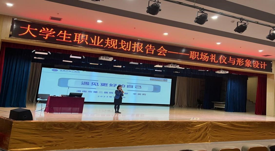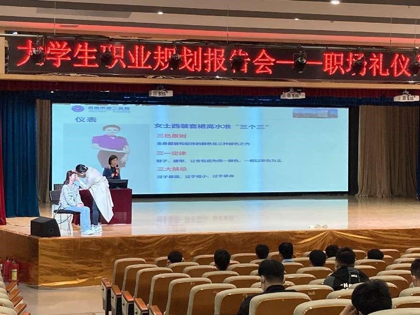 为帮助公司员工能够更清晰地进行个人职业规划,掌握必要的职场礼仪和要求,提升老员工职业素养。太阳成集团tyc122cc于3月8日下午14:30分在图书馆一楼报告厅举办老员工职业规划报告会及职场礼仪与形象设计展示活动,特邀公司优秀员工渭南市第二医院外联部李英莉主任主讲,2023届计算机专业、大数据技术专业全体实习员工参加,招就科副科长罗彦庆主持。