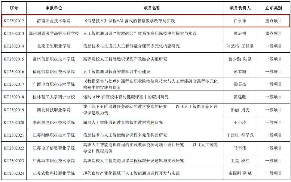 近日,教育部职业院校信息化教学指导委员会正式公布了2025年度全国高等职业院校信息技术与人工智能通识课程教学改革研究项目立项名单。公司太阳成集团tyc122cc白永祥教授主持的“《信息技术》课程+AI范式的智慧教学改革与实践”成功获批立项并入选重点项目,标志着公司在信息技术与人工智能通识课程教学改革领域取得了重要突破,为进一步提升教学质量和人才培养水平奠定了坚实基础。