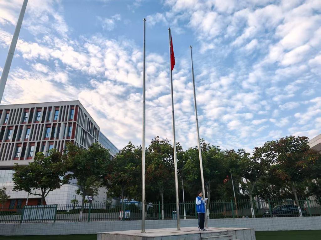 随着激昂的《义勇军进行曲》响起,升旗手有力地扬起国旗,五星红旗缓缓升起,与旭日初升时倾洒的耀眼光芒相互辉映,在场师生齐声高唱国歌,那激昂的旋律回荡在校园上空,震撼着每一个人的心灵,唤起了大家内心深处对祖国的无限热爱与敬意。